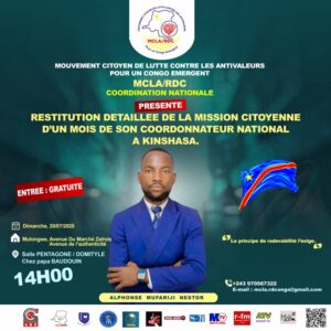 Le Mouvement Citoyen de Lutte contre les Antivaleurs pour un Congo Émergeant (MCLA-RDC) organise une importante rencontre publique, ce dimanche 20 juillet 2025 à 14h00, à la salle Pentagone/Domytile, située sur l’avenue du marché Zaïrois.